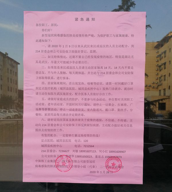 1月30日,中陜核工業集團二一四大隊有限公司新型冠狀病毒感染的肺炎疫情防控工作領導小組在城固基地組織召開了疫情防控工作領導小組會議,與二一四社區居委會、陜健醫二一四醫院三方共同對當前防疫工作進行了再安排再部署。